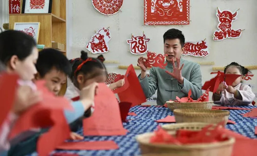 在河南省省级非物质文化遗产孟津剪纸传承人的指导下,河南洛阳孟津县第二县直幼儿园的小朋友们学习制作“牛”主题剪纸作品,感受传统剪纸艺术魅力。