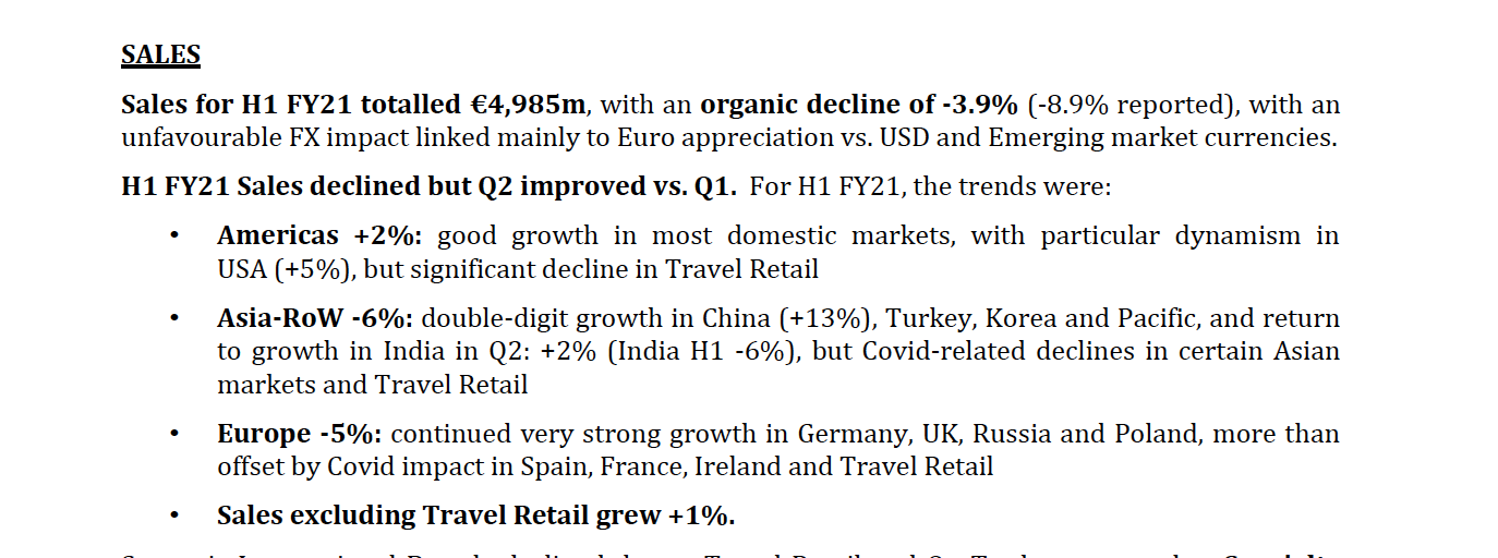 对比一季度各地区业绩来看,2021财年上半年,美洲市场上涨2%,其中美国市场实现增长5%,但旅游零售渠道继续低迷;亚洲和其他地区下跌6%,其中中国增长13%,土耳其、韩国和太平洋地区市场均实现两位数增长。印度市场从第二季度开始恢复增长实现增长2%;欧洲市场下跌5%。