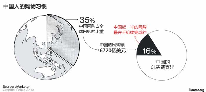 中国的网络购物支出达6720亿美元,占其总消费支出的16%。市场研究公司eMarketer开展的一项调查显示,近一半的网络购物是在手机端完成的。