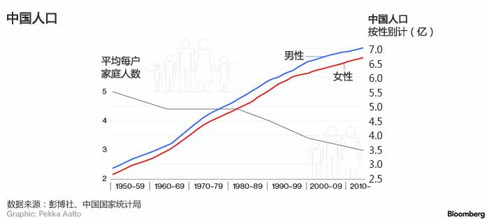 2014年,平均每户中国家庭的成员数量从1950代的5人降至不足3人。中国性别不平衡的现象也是全球最严重的:新生儿男女比例为116:110,而全球平均新生儿男女比例为107:100。