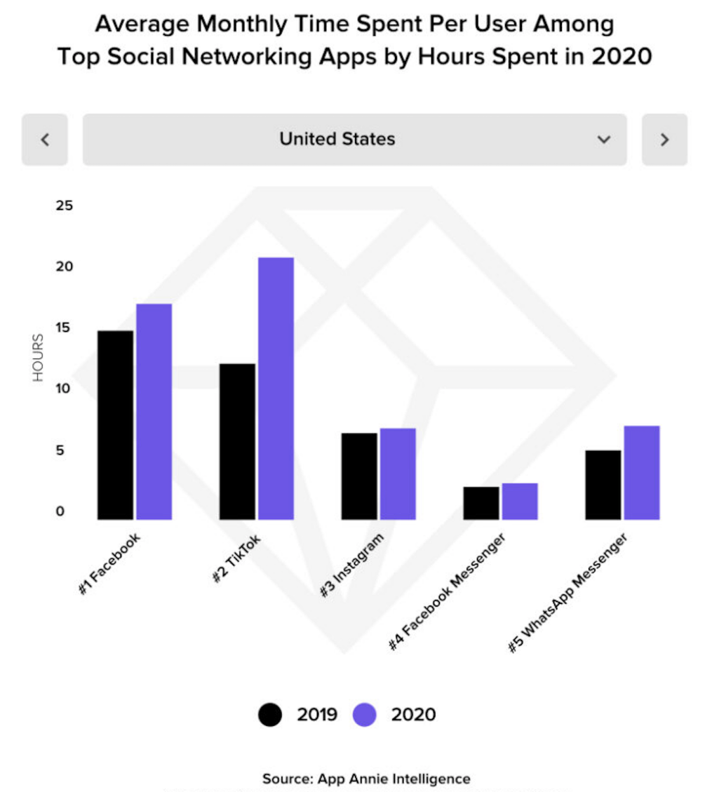 根据App Annie报告称,2020年用户在TikTok上花费的时间同比增长325%,每月平均用户时长超越了Facebook。