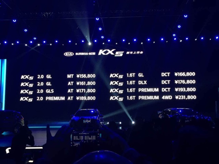 2016年3月10日,东风悦达起亚新KX5在重庆上市, KX5共发布1.6T及2.0L两个排量共8款车型,售价区间为15.68万-23.18万。KX5提供透明白、珍珠白、钛银色、梦幻蓝、青铜金、咖啡棕、极光黑七款外观颜色,及黑色、黑棕、黑米三款内饰。