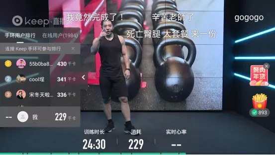 直播课程可以连接Keep手环和动感单车,配备手环的用户相比没有手环的用户有更好的体验感,手环用户能够看到自己真实的卡路里消耗值和实时心率,直播页面还设置了手环用户排行榜,消耗卡路里值最高的前50位手环用户上榜,这种机制能让用户产生竞赛感,刺激用户加速运动以占据更高的排位。