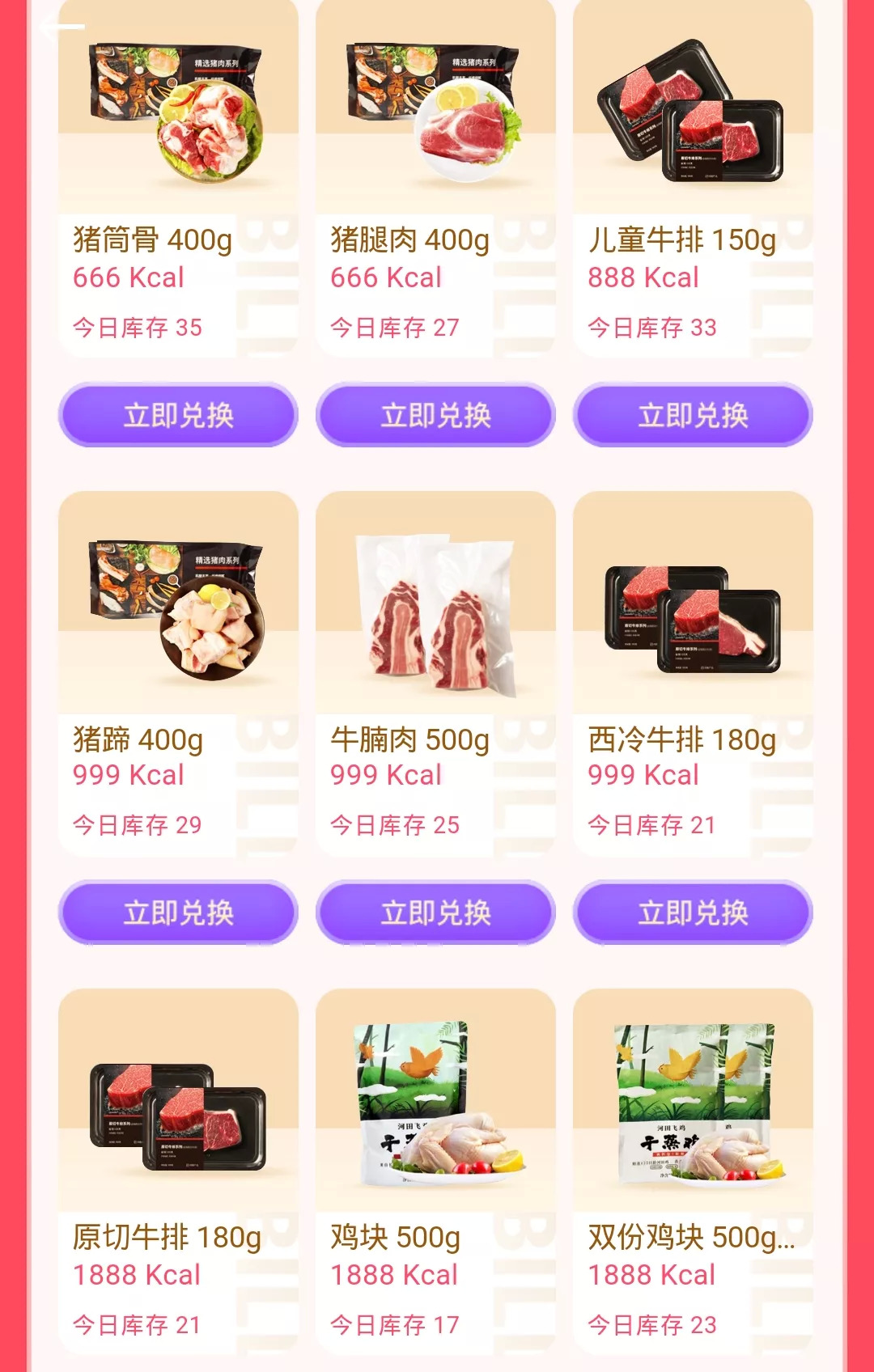 在“年货肉铺”里有卡路里值666千卡、999千卡、1888千卡和2666千卡的各种肉类,用户根据自己消耗的卡路里数等额兑换。但是这些“年货”库存并不多,在每天中午12点开抢后都会被迅速兑完下架。