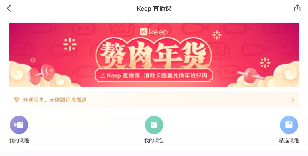 点进Keep“赘肉年货”页面,一片红色映入眼帘,新年气氛浓烈,用户下拉便可看到直播课程和可兑换的“年货”。
