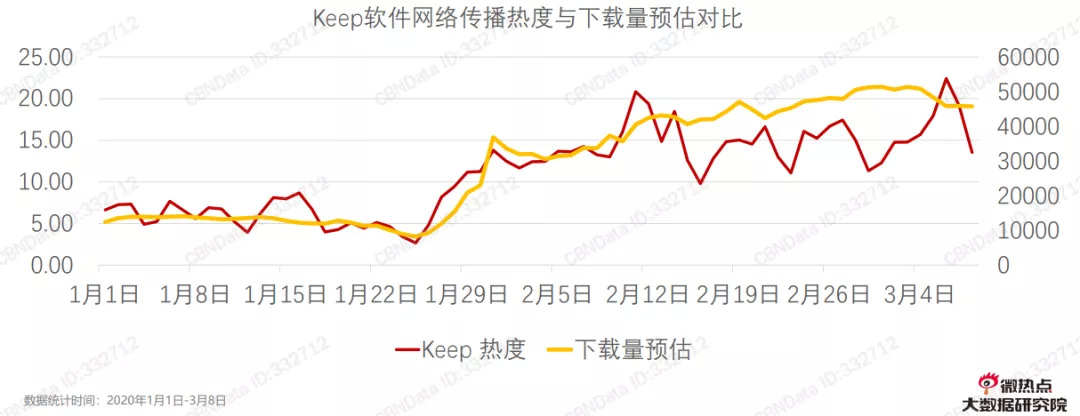 根据《疫情影响下云健身行业关注度分析报告》,疫情期间,Keep的网络传播热度与下载量均在1月27日左右出现大幅度攀升,远超其他同类运动软件。另有数据显示,Keep在疫情期间月活跃用户量较2019年同期增长超过20%。