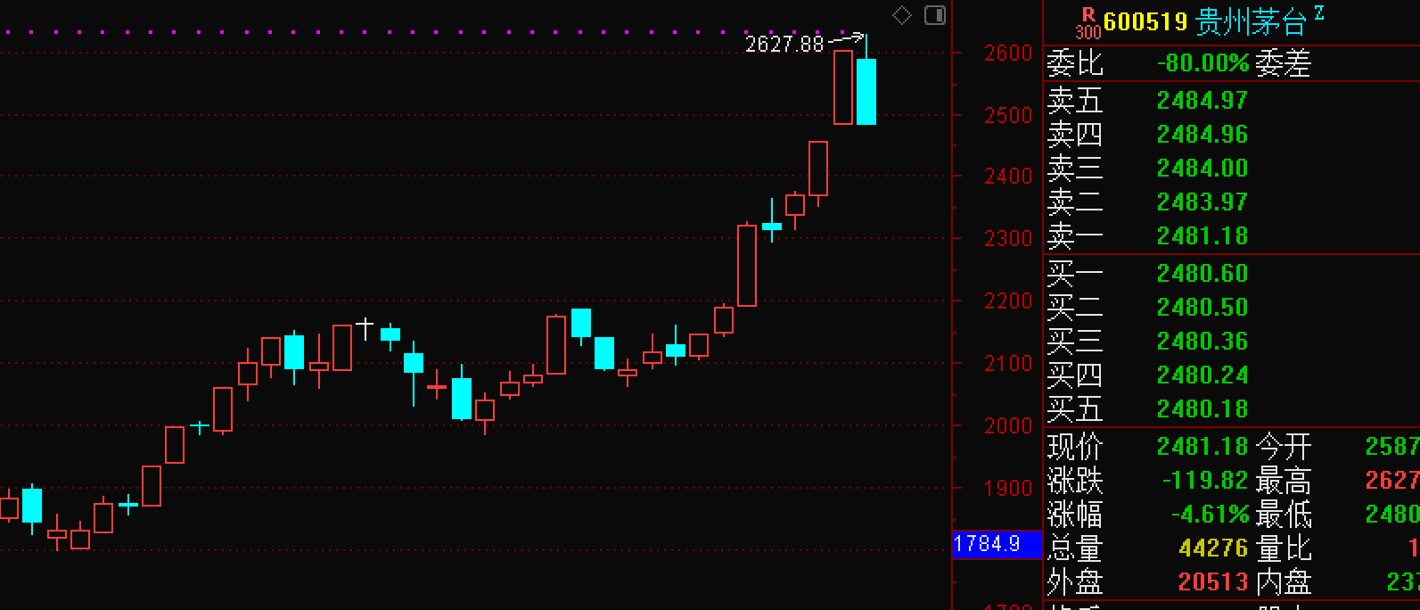 2月18日,沪深指数跳空高开,随后市场持续走弱,创业板指率先翻绿并大跌3%,沪指涨幅明显缩窄,高价股普遍回调。截至午时收盘,酿酒板块领跌。龙头贵州茅台在平开没多久后,出现下跌,午时跌幅已经扩大至4.61%,股价也跌破了2500关口至2481.18元,市值回缩为3.12万亿。