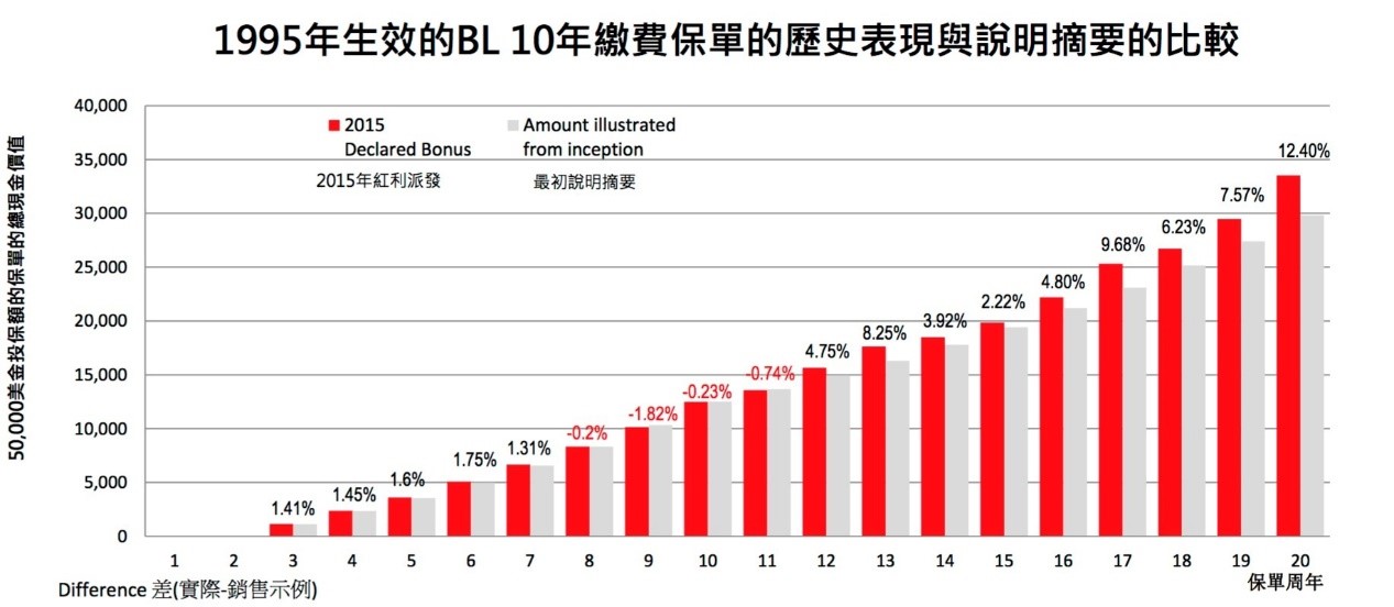 香港保险的“非保证”收益一般是按照保险公司过往的收益水平进行计算,根据保险公司的收益状况变动而变动,“非保证”的金额既可能低于,也可能高于预期收益。根据保诚更美好1995年-2015年长达20年的分红记录,实际红利收益相比于计划收益,浮动区间为-1.82%-12.4%,且仅有4年为向下浮动。