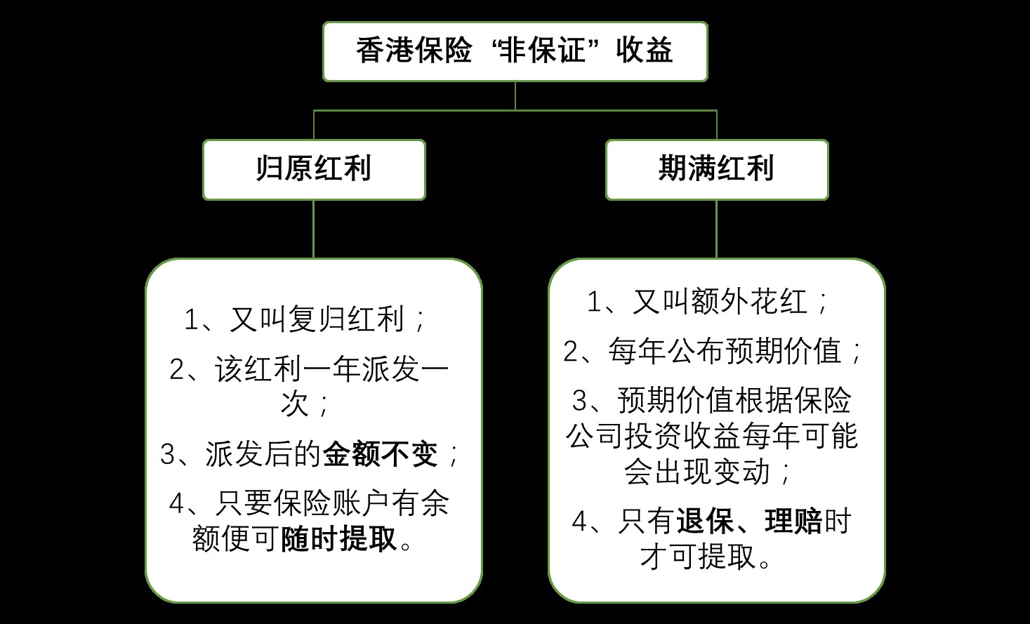 香港保险的“非保证”部分主要是有两部分决定的:归原红利和期满红利。其中归原红利会进行每年一度的派发,派发之后保证可得,只要保险账户中有红利余额,投保人就可以随时提取。而期满红利则是每年公布预期金额,这部分金额会随保险公司投资收益而上下浮动,且只有在退保、理赔时才可以提取。