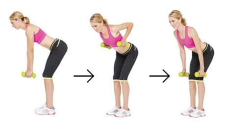 重新放下哑铃,将臀部向后伸出回到开始姿势。