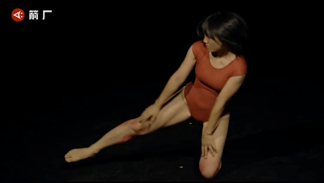 美芽手上沾满红色涂料,在腿部留下类似抓痕的图案。其他舞者看到直呼涂得太多了,美芽却很满意,在众人的惊呼下她又快速地留下几道新的抓痕。远远看上去,腿部像是在愤怒地燃烧。