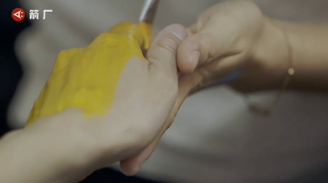 慧恒请伙伴帮自己的手涂颜料,对方追问慧恒满不满意,慧恒哭笑不得地紧闭双眼,不知如何作答。