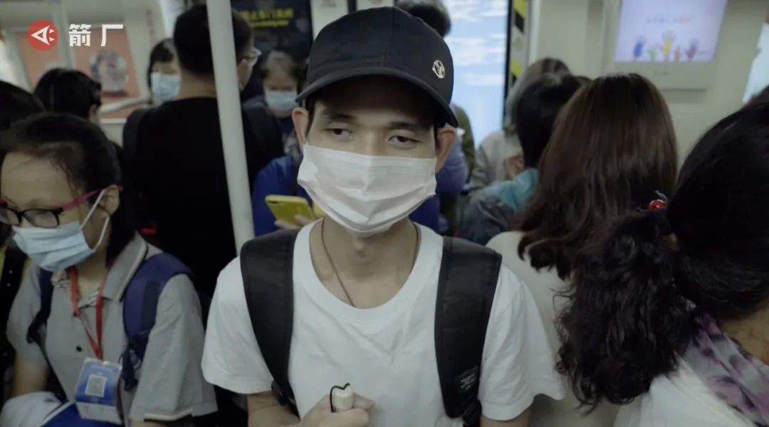 慧恒拄着盲杖在地铁上通勤