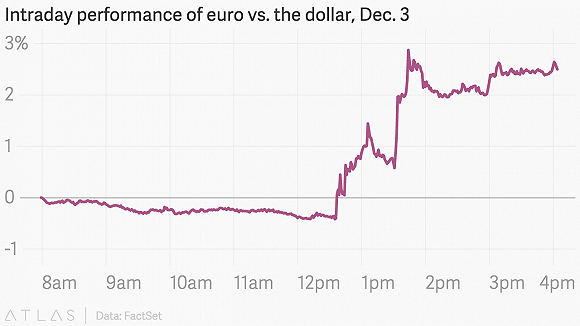 然而到了12月3日当天,欧洲央行宣布的宽松政策力度不及预期。市场预期关键利率将下调至-0.4%,但当时只下调至-0.3%。消息一出,欧元没有因为这样的宽松货币政策下跌,反倒因为宽松力度弱于预期而大涨。