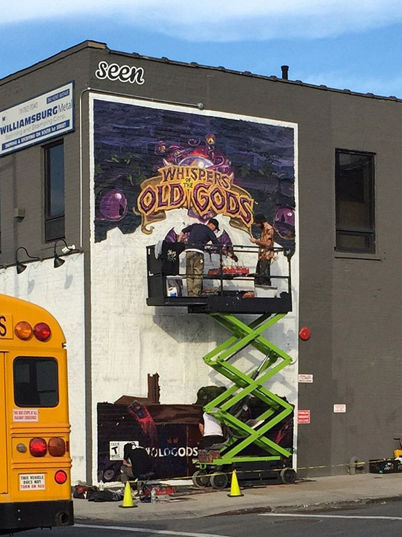 有趣的是,这条最重磅的消息泄露的来源竟然是——一块未完工的油画广告牌,目前它正在纽约布鲁克林街头被搭建。有炉石粉丝撞见工作人员在威廉斯堡侧墙上作画,于是就照了下来。