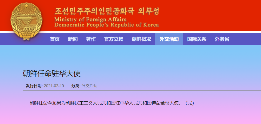 朝鲜外务省网站2月19日消息,朝鲜任命李龙男为朝鲜驻中国大使。李龙男为朝鲜内阁副总理、前贸易相。