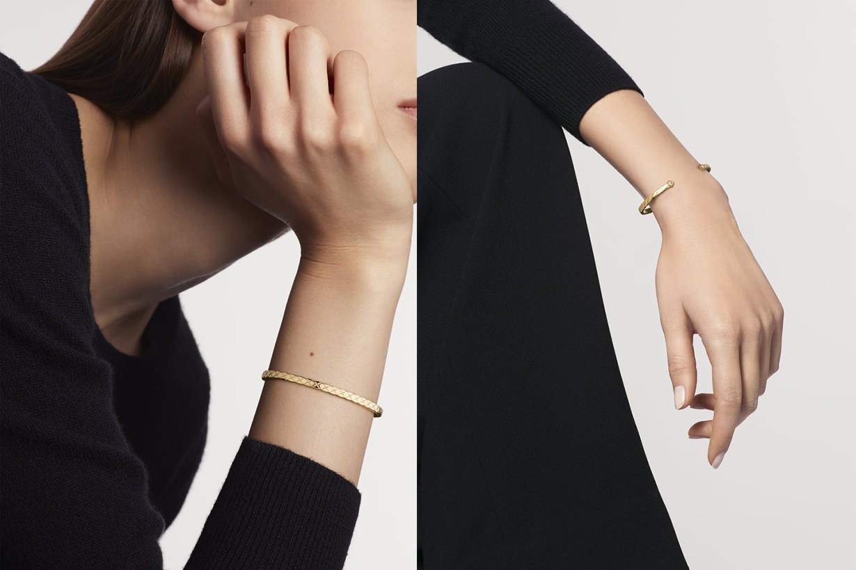 设计上延续一贯的简约中性风,典雅之外不失型格魅力。系列包含迷你戒指、耳环、耳扣、手镯等单品选择,以及黄金、白金、米色金、镶钻等不同材质。圆模雕刻与蚀刻工艺塑造流畅弧面与菱格纹,镶钻款还以明亮圆钻嵌入格纹中。