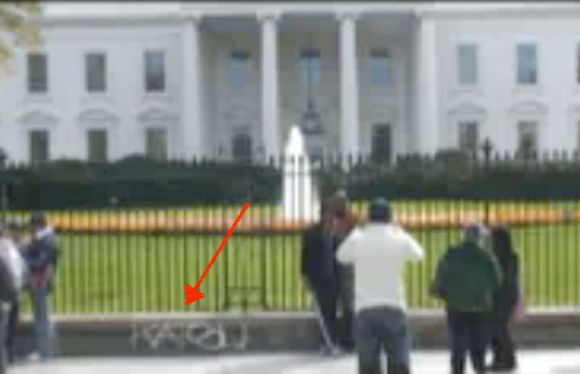当然到目前为止还没人敢这么干过,但是这种事情又怎么能难倒脑洞大的艺术家。他想出了个好办法,那就是假装在白宫外涂了个鸦,录下视频后再找人合成,于是无辜的观众在YouTube上看到的情形就是这样的了: