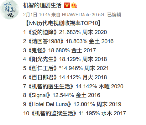 即使是在韩国,《哲仁王后》的播出成绩也堪称优异,是tvN建台以来收视率最高的古装剧。