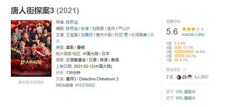 令人感到意外的是,《唐人街探案3》这部备受关注的悬疑喜剧电影在口碑上遭遇了滑铁卢,其豆瓣评分从开画的7分一路下跌至5.6分,赢了票房,却输了口碑。