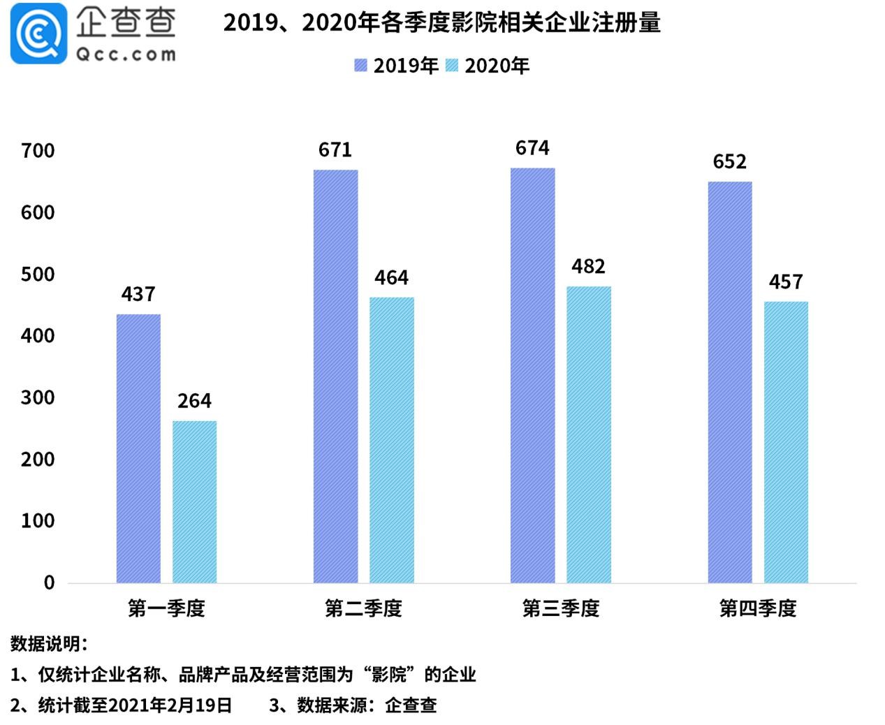 企查查数据显示,2020年全国共新增1667家影院相关企业,同比下降32%。从季度数据来砍,2020年一季度受疫情“黑天鹅”影响,注册量仅264家,同比下降40%。二季度随着疫情的好转,相关企业注册量达464家,环比猛增76%。三、四季度注册量分别为482家、457家。