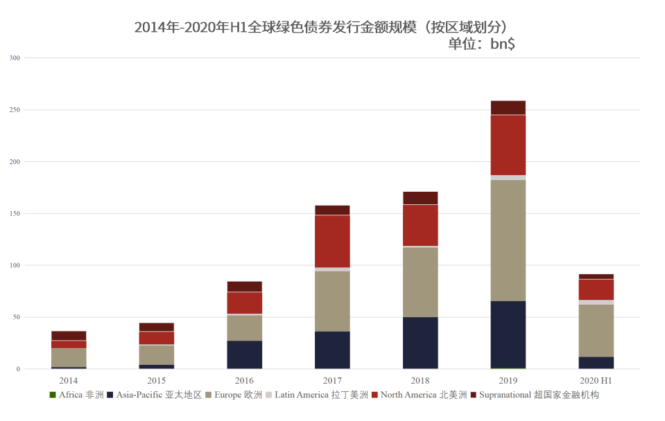 一方面,宏观环境及政策因素推动绿色债券发展,越来越多的国家意识到绿色经济发展的重要性,全球大部分国家纷纷向绿色经济转型,资金需求量庞大。