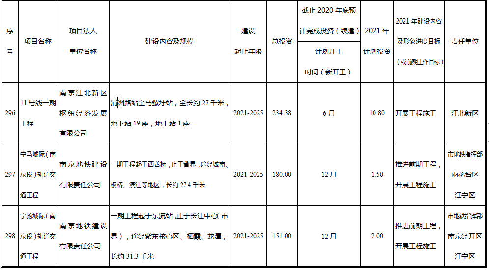 近日,南京市人民政府印发《南京市2021年经济社会发展重大项目计划》,该文件中明确提出,包括11号线一期工程在内的4条地铁明确开工时间。