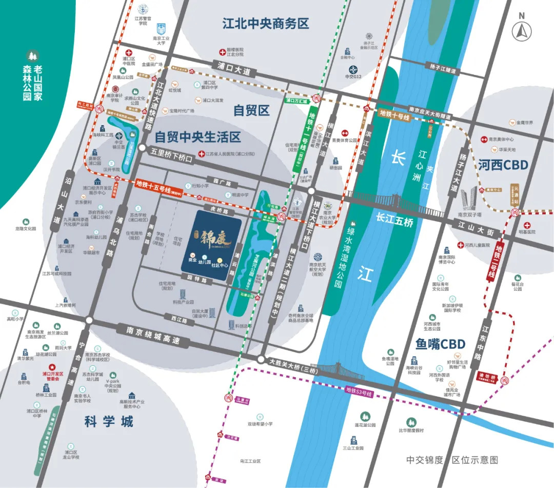 项目背靠江北新区研创园,企业园区气氛浓厚,并且,项目自带万达广场,毗邻长江五桥,过往江北江南自由,值得一提的是,项目距离南京农业大学江北校区非常近,人文气息浓厚,因此自住十分舒适。