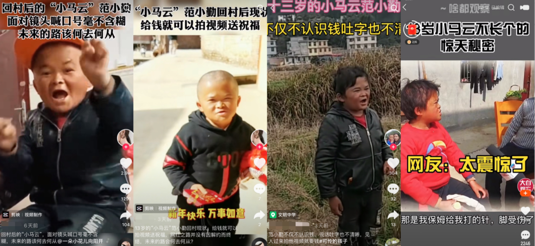 算算时间,小马云今年14岁了,同龄人正在读初中,而据视频里呈现的状态,他的智力水平却还像当年出道时8岁的样子,身高也和当年一样,几乎没变。更糟糕的是,他被发现腿上有很多针眼,怀疑是被注射了抑制生长的激素。有人拍他时,甚至会脱下他的裤子查看有没有针眼,小马云本人则毫无反应。