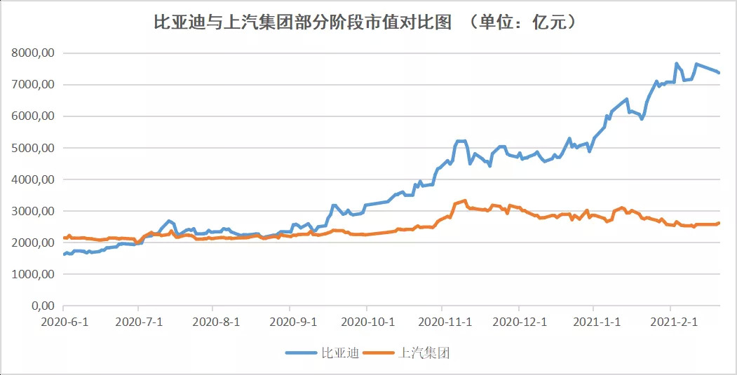 比亚迪与上汽集团部分阶段市值对比图,数据来源于Wind,连线出行制图