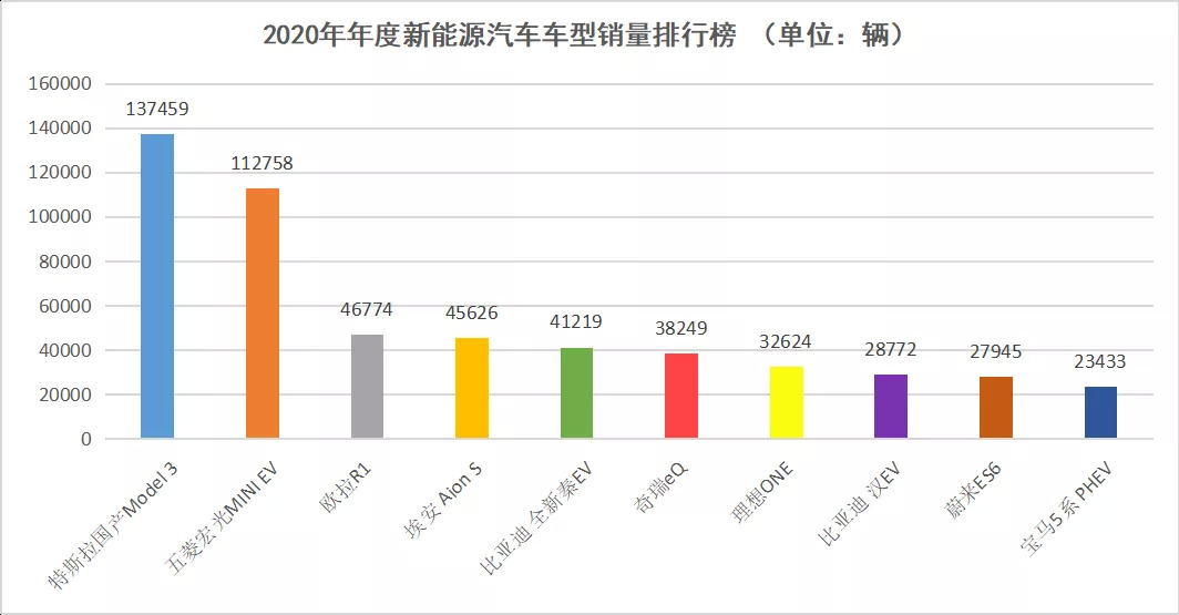 2020年年度新能源汽车车型销量排行榜,数据来源于乘联会,连线出行制图