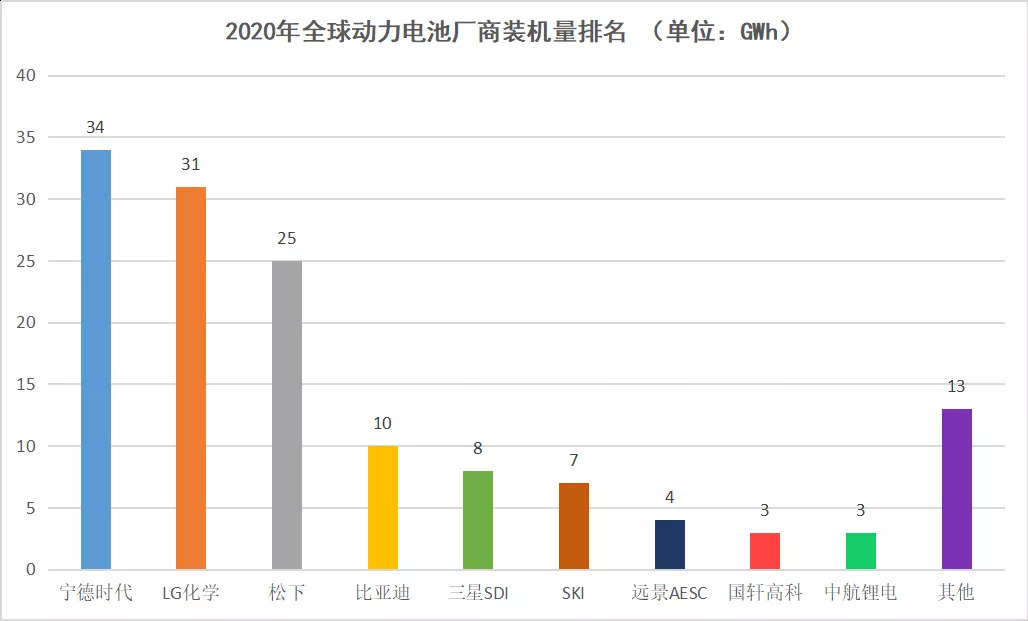 2020年全球动力电池装机量排名,数据来源于SNE Research,连线出行制图