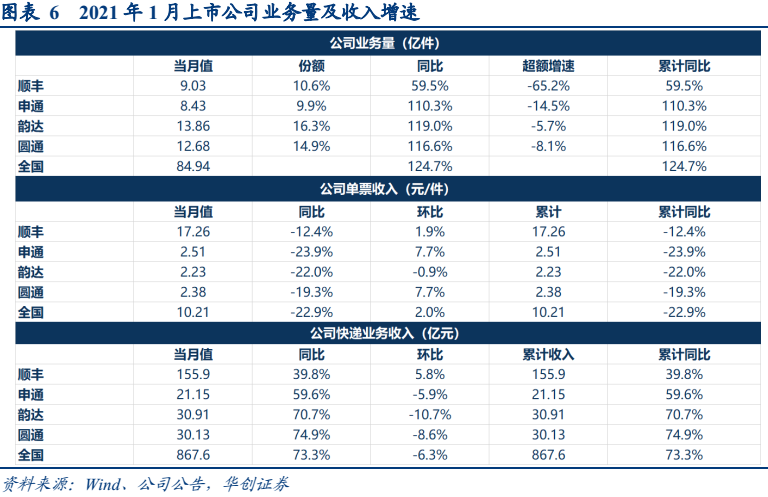 来自华创证劵最新研报的统计数据显示,2021年1月,顺丰控股、韵达股份、圆通速递、申通快递的市场份额分别为10.6%、16.3%、14.9%、9.9%。