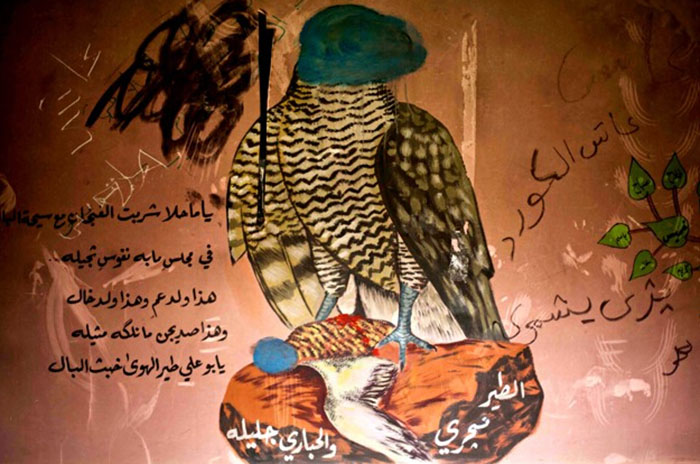 这里还总是会爆发其他的无形战争。这里的什叶派清真寺里面的墙壁曾装饰有画着人和动物的壁画,结果圣战主义者来到这里之后,在每个人和动物的脸上都画上了蓝色的圆圈。激进的逊尼派认为,对于活的生物的描绘是一种盲目崇拜的行为。在这面墙上,一只头部被涂成了蓝色的猛禽以胜利的姿态骄傲的站在高处,在它的下面是它捕获的猎物,头部同样被涂成蓝色。