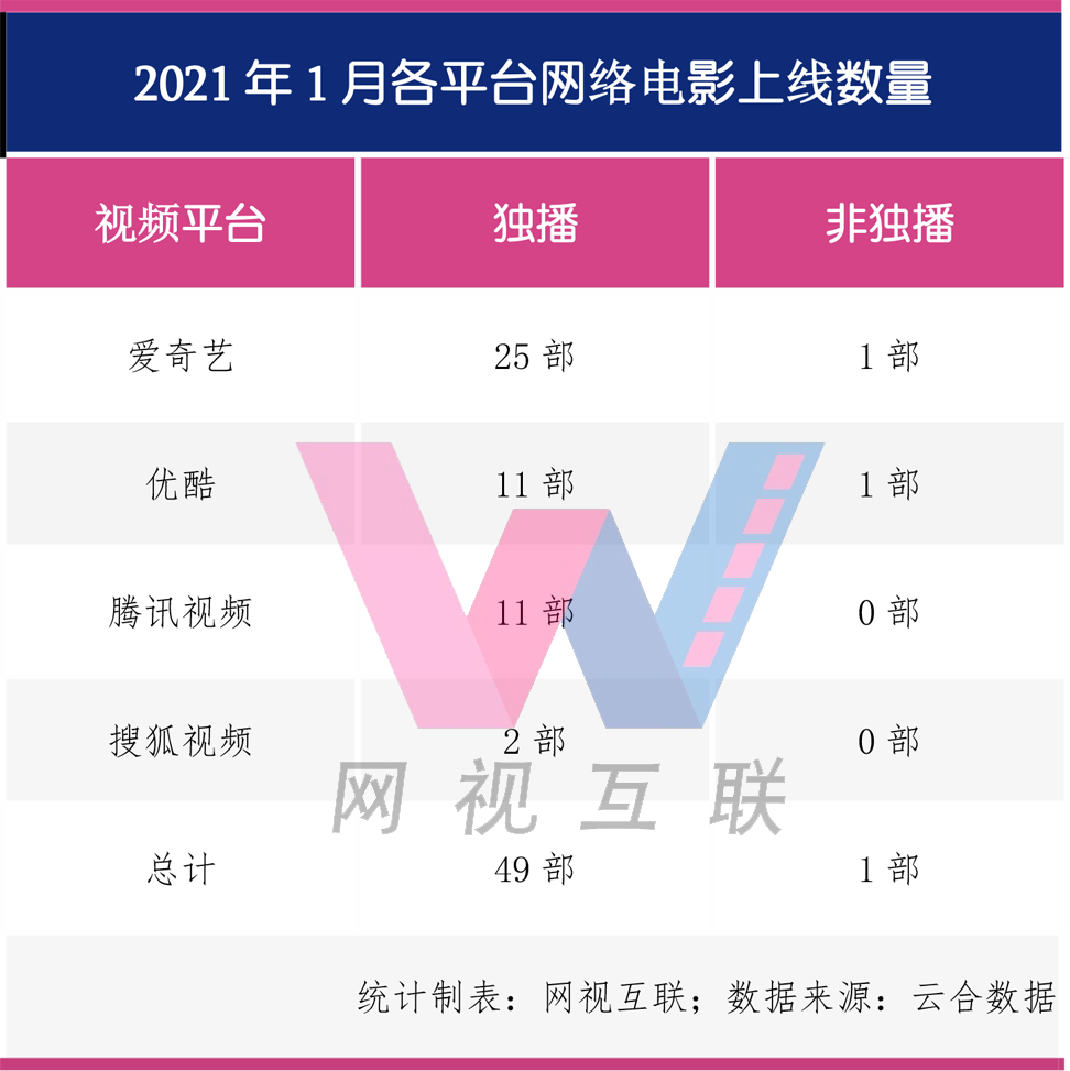 据云合数据,1月份爱奇艺、优酷、腾讯视频、搜狐视频共上线网络电影共计50部。