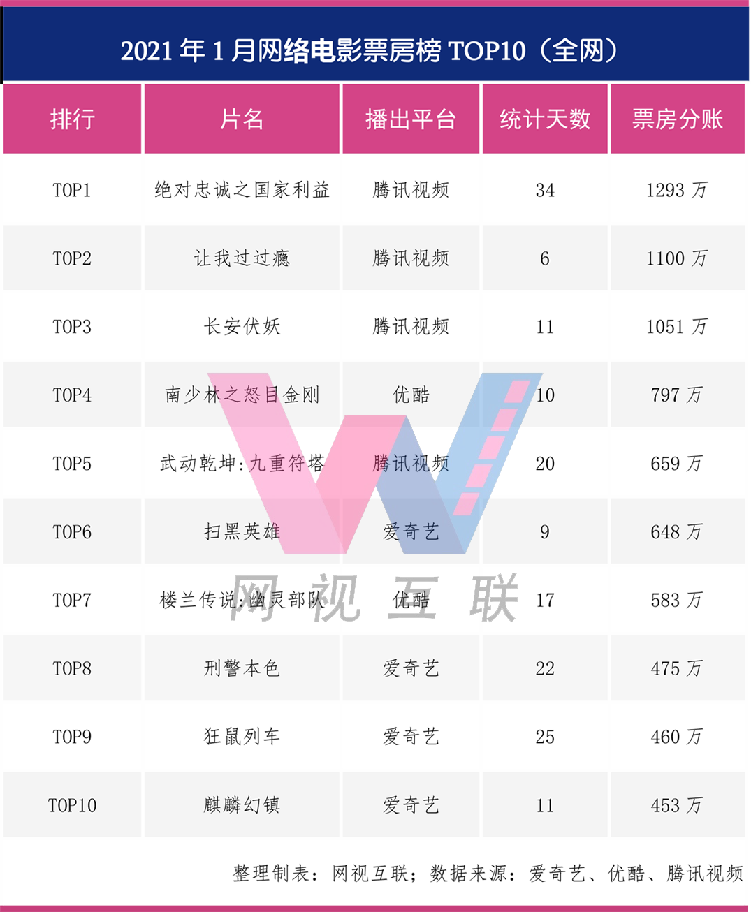 网视互联(ID:wxs360)根据爱奇艺、优酷、腾讯视频等公布的相关票房数据,整理出了全网网络电影票房分账榜TOP10。