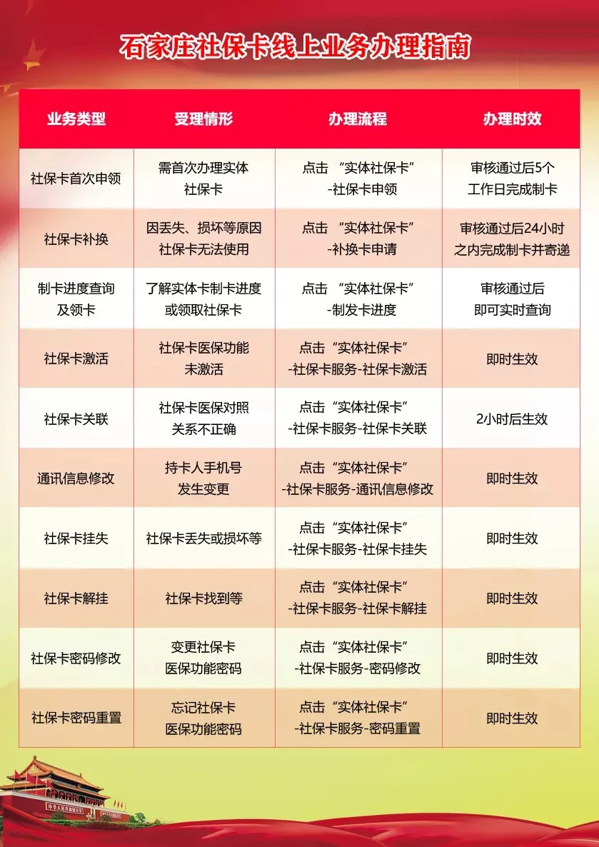石家庄市社会保障卡首次申领、补(换)卡、挂失、解挂、密码修改与重置、持卡人信息查询等10余项高频业务已全部实现网上办理,快递到家。市民可以在“石家庄社会保障卡”微信公众号,享受7x24小时“不见面”服务。