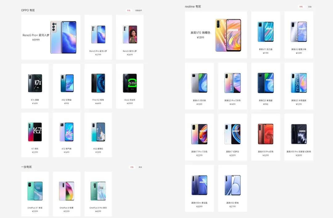 目前,欢太商城官网显示,OPPO旗下拥有Reno系列、K系列、A系列、Find X系列、Ace系列五条产品线;Realme旗下拥有V系列、X系列、Q系列三条产品线;一加旗下在售一个系列。