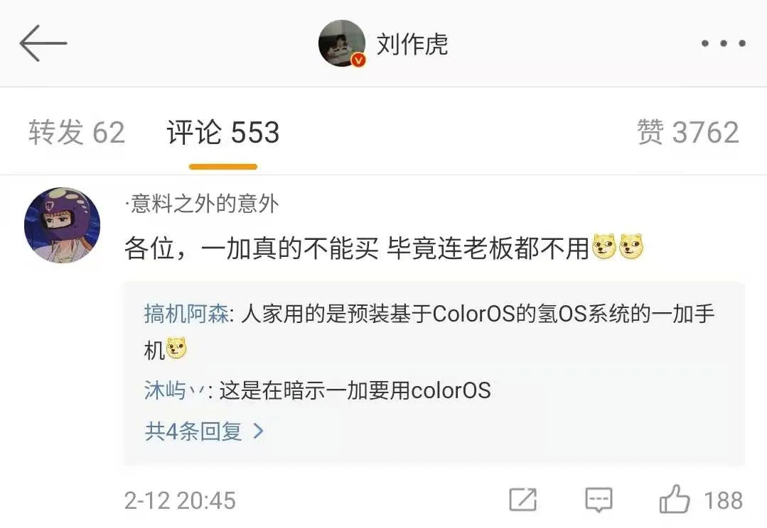 业内人士解读,“刘作虎这条微博要么是小编一时疏忽忘了换手机,不然就是有意而为之。后者的倾向性更大一些,正应了市场上那些关于一加将用上ColorOS的小道消息,借此试探网友的接受程度。”