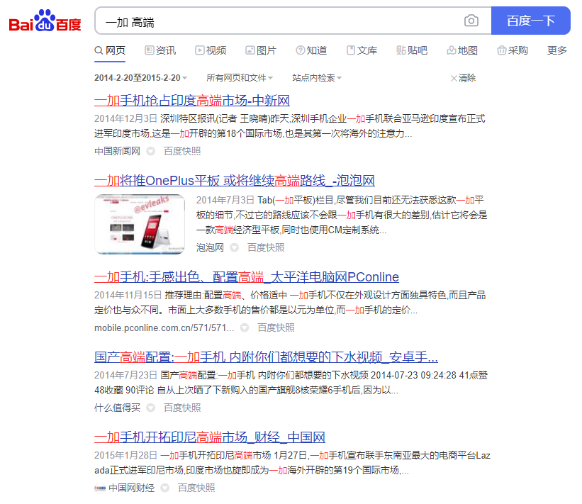 以“一加”、“高端”为关键词进行搜索。2014年一加旗下首款手机上市,随之便有了一加手机抢占高端市场的相关报道。而后几年里的报道里,一加逐步在中国以外的全球多个市场的高端档位站稳脚跟,成为各大机构高端手机榜单的常客,不管真实性如何,业界还因此有了“国内开花国外香”的说法。