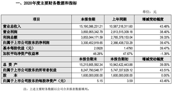 2月21日,智飞生物(300122.SZ)披露2020年度业绩快报,2020年,公司实现营业收入151.9亿元,同比增长43.48%;实现归属于上市公司股东的净利润33亿元,同比增长39.47%;加权平均净资产收益率从2019年同期的47.67%小幅下滑至46.28%。