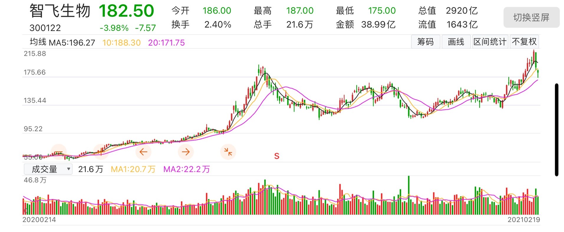 需要关注的是,2020年以来,智飞生物的股价已大涨269%。2月19日,智飞生物最新股价报收182.50元/股,目前市值2920亿元。