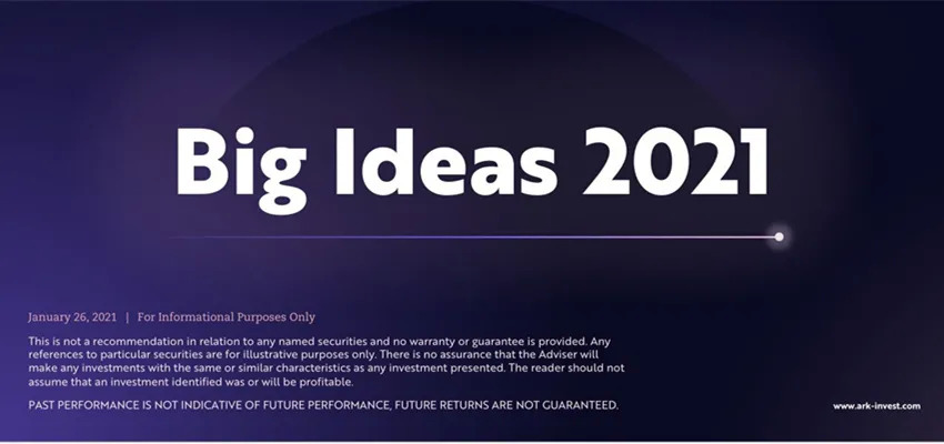 近日,知名投资管理公司方舟投资(ARK Investment Management LLC)发布了最新的《Big Ideas》报告,这家由“女版巴菲特”之称的凯瑟琳·伍德创建的投资公司从2017年起,在每年年初发布一期《Big Ideas》报告,预测这一年最有投资价值的前沿技术。在之前的报告中,ARK就准确的预测到了特斯拉和比特币的投资机会。