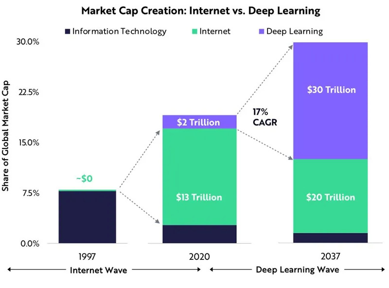 根据ARK的研究,未来15-20年,深度学习将为全球股票市场增加30万亿美元的市值。