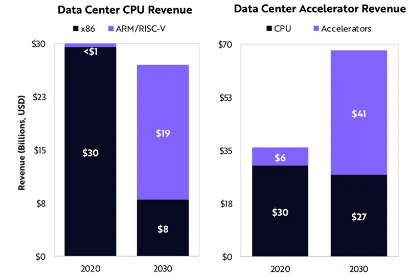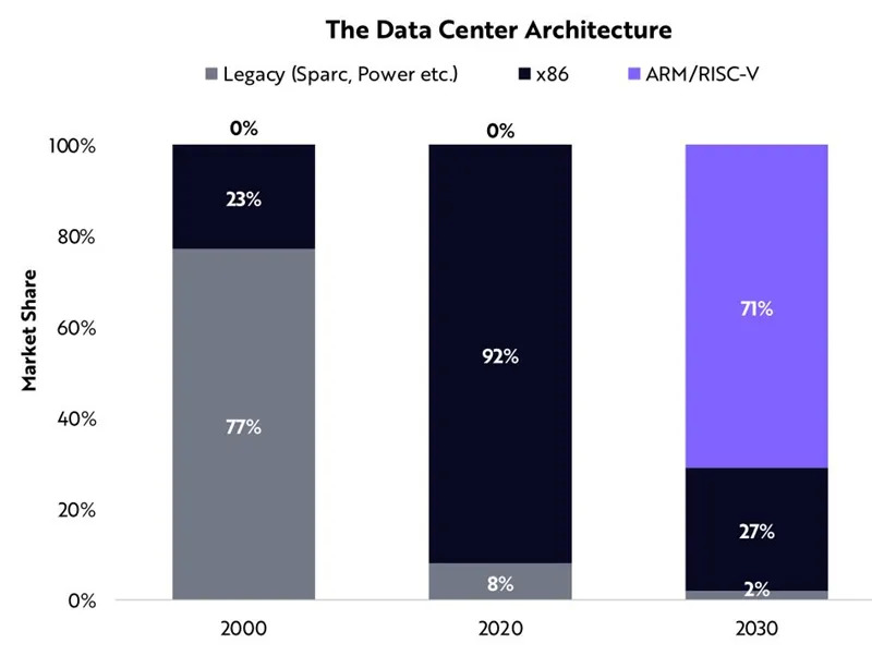 ARK预测,ARM和RISC-V的结合将从2020年的0%市场份额,到2030年达到71%的服务器市场份额。