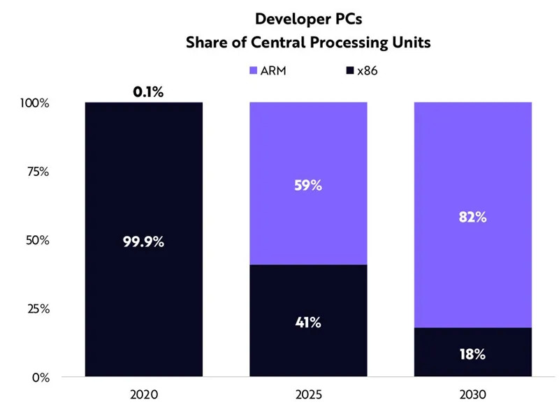 与此同时,微软也在加倍努力支持在ARM处理器上运行Windows操作系统。根据ARK的研究,到2030年,大多数开发人员的个人电脑将使用ARM处理器,这标志着英特尔x86时代的终结。