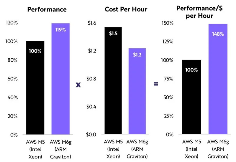 AWS的Graviton 2比英特尔的cpu更便宜,速度更快,相同价格可以提供48%的额外性能。未来,AWS可能会将其大部分服务器迁移到基于ARM的处理器上。