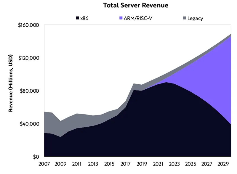 到2030年,ARM和RISC-V可能成为新的处理器标准。采用ARM处理器的PC和服务器将创造出一个拥有足够规模、工具和供应商支持的生态系统,挑战英特尔的x86。