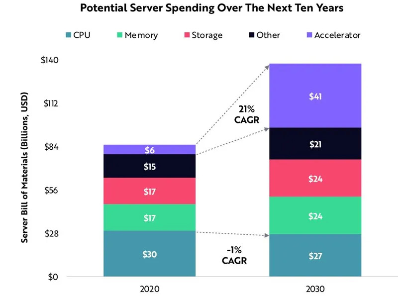 加速器,包括GPU、张量处理单元(TPU)和现场可编程门阵列(FPGA),在执行苛刻的计算任务,包括人工智能(AI)、分析、药物发现和云游戏方面有着广发的用途。到2030年,加速器将取代CPU成为服务器的主要计算引擎。