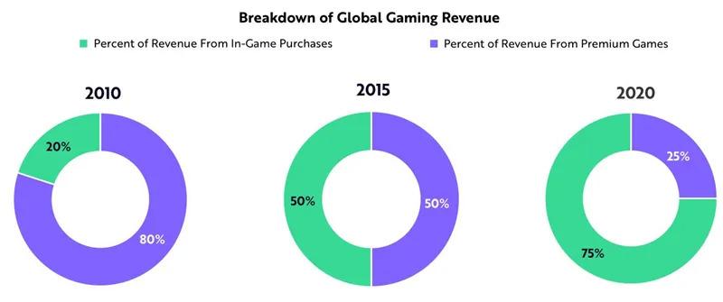 随着电子游戏的发展,它们的商业模式也在不断发展,现在电子游戏的盈利模式正转向虚拟商品。根据ARK的研究,在过去10年里,游戏内部购买占游戏总收益的比例从20%上升到75%。到2025年,这一比例将达到95%。全球游戏收益细分